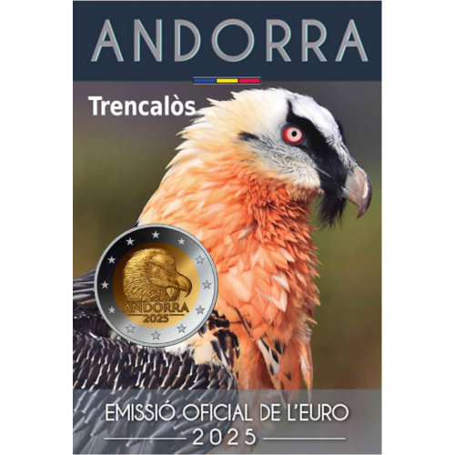 Officiële 2 euromunt 2025 van Andorra, met als thema de Baardgier (Trencalòs). Uitgegeven in Brilliant Uncirculated (BU) kwaliteit en geleverd in een officiële coincard. De oplage bedraagt slechts 60.000 stuks.