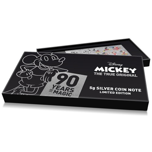 Issued to mark 90 Years of Mickey Mouse™, this officially licensed 5g silver coin note features colourful images of Mickey through the decades, from his debut in 1928 to the modern day.