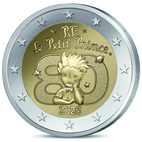 Deze officiële Franse 2-euromunt uit 2026 is gewijd aan De Kleine Prins, het wereldberoemde literaire personage van Antoine de Saint-Exupéry.