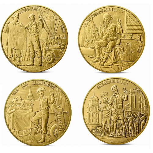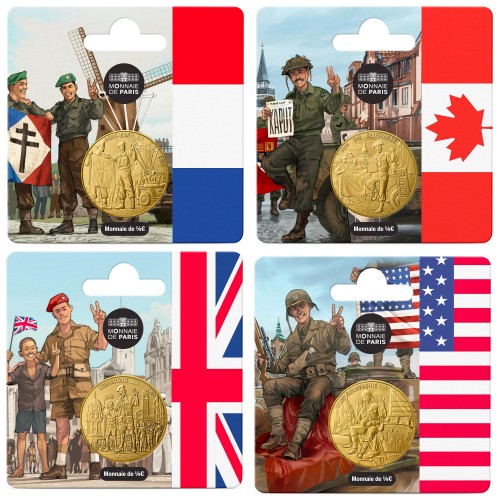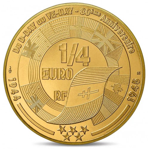 Deze speciale uitgifte van de Monnaie de Paris bestaat uit vier verschillende 25 cent munten, opgedragen aan de 80e verjaardag van V-E Day.