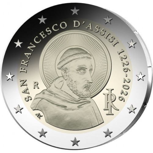 Deze officiële Italiaanse 2-euromunt uit 2026 is gewijd aan Sint Franciscus van Assisi, stichter van de Franciscaanse orde en één van de belangrijkste religieuze figuren uit de Europese geschiedenis.