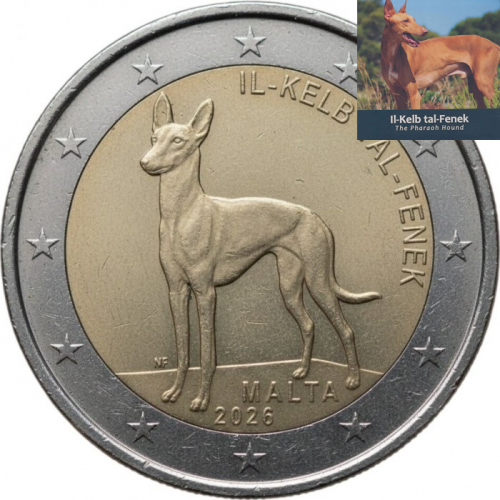 Deze officiële Maltese 2-euromunt uit 2026 is gewijd aan de Faraohond, in het Maltees bekend als “Il-Kelb tal-Fenek”. Dit elegante hondenras is het nationale symbool van Malta en heeft een rijke historische en culturele betekenis.