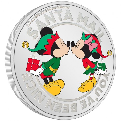 The 2022 Disney Christmas coin "Santa Mail" features Mickey Mouse delivering letters to Santa Claus in a charming festive scene. Struck from ½ oz of pure silver with proof finish and colour details.