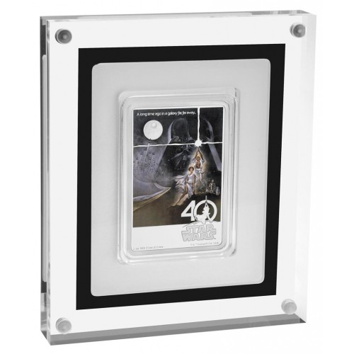 The coin comes presented in a clever perspex holder, designed to frame the coin and allow for easy display. The Certificate of Authenticity sits within the packaging, and both are branded and stylized to commemorate the 40th Anniversary. This makes it an ideal gift for any Star Wars fan or coin collector.