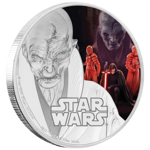 This Supreme Leader Snoke 1oz Silver Coin displays images of Supreme Leader Snoke from Star Wars: The Last Jedi, along with Kylo Ren and members of the Praetorian Guard.