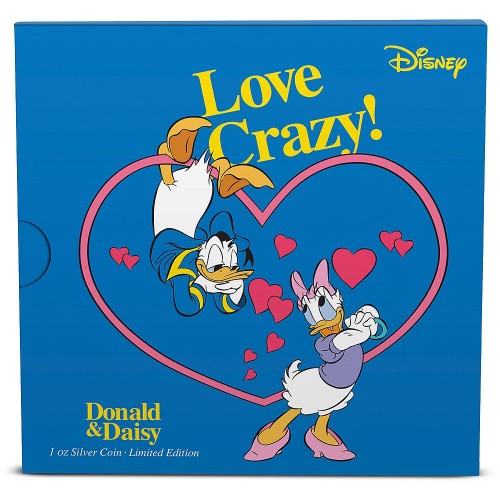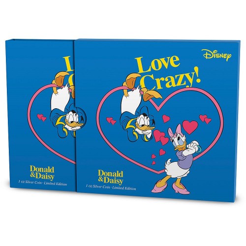 The second release in the Disney Valentine coin series is “Love Crazy”, dedicated to Donald and Daisy Duck. The colourful proof design shows the couple in a playful, loving scene.