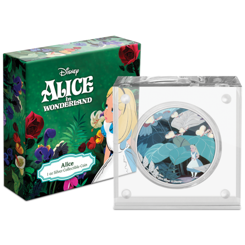 Celebrate 70 years of Disney’s animated classic Alice in Wonderland with this 1 oz pure silver coin featuring Alice herself. This coin is part of the official Disney Alice in Wonderland 70th Anniversary 2021 series, consisting of four coins: Alice in Wonderland, Tweedledee & Tweedledum, Mad Hatter, and White Rabbit.