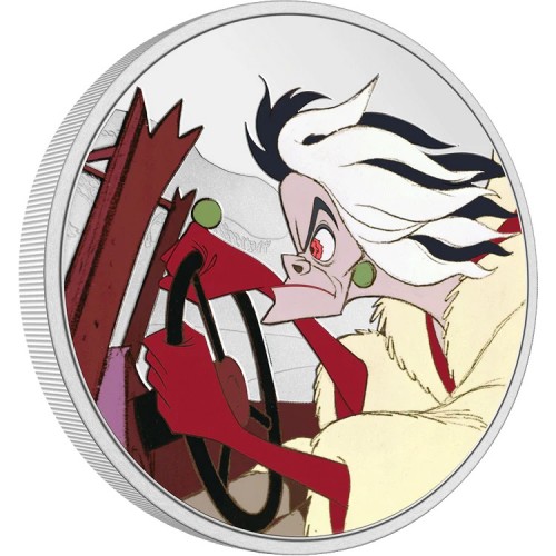 The coloured reverse highlights Cruella’s dramatic presence, contrasted against frosted silver details. Obverse bears the Ian Rank-Broadley effigy of Queen Elizabeth II.