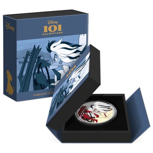 Marking 70 years of 101 Dalmatians, this 1 oz silver proof coin showcases the infamous villain Cruella de Vil. It is part of the official four-coin 101 Dalmatians Anniversary series alongside Love, Family, and Plantation.