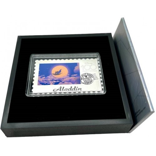 This 2023 silver proof stamp coin celebrates the Disney classic Aladdin (1992), featuring Aladdin, Princess Jasmine, and the Genie. A magical tribute as part of the Disney 100 Years of Wonder series.
