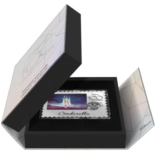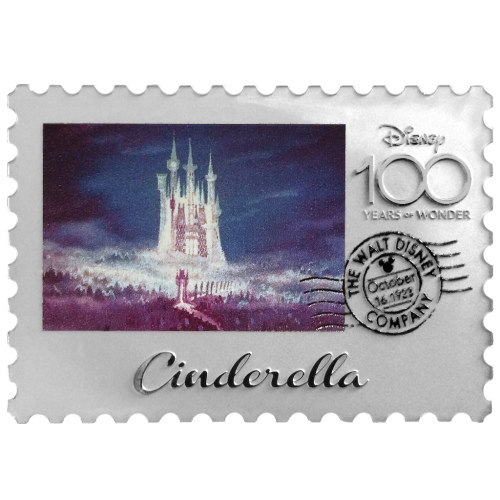 Celebrate the 100th anniversary of Disney with this unique stamp-shaped silver proof coin featuring Cinderella, one of Disney’s most beloved princesses. The iconic artwork highlights her timeless fairytale and legacy.