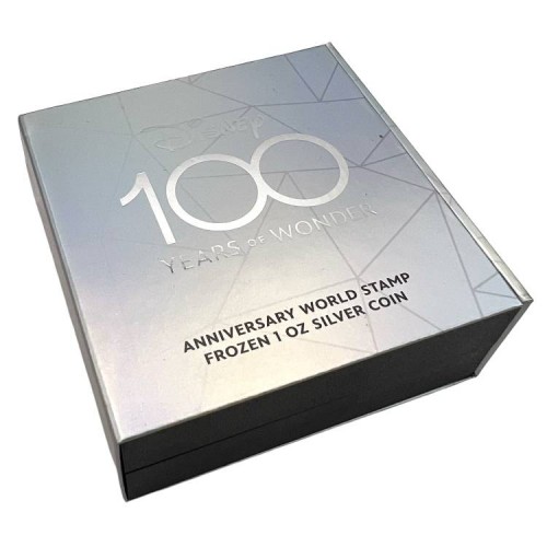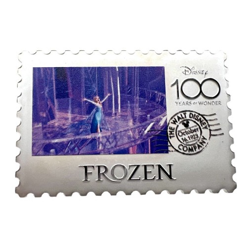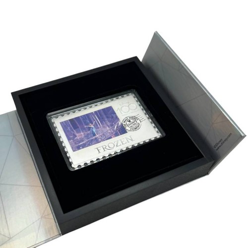 This stamp-shaped silver coin celebrates Frozen (2013), the modern Disney masterpiece featuring Anna, Elsa, and Olaf. Released as part of the 100 Years of Wonder jubilee.