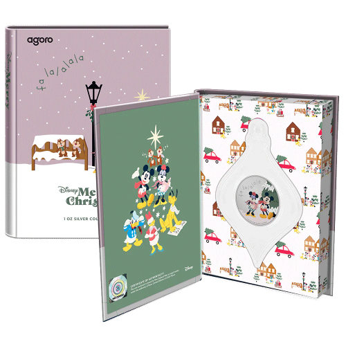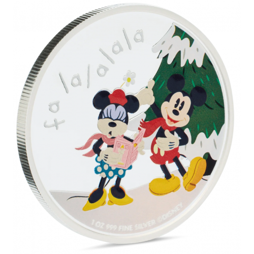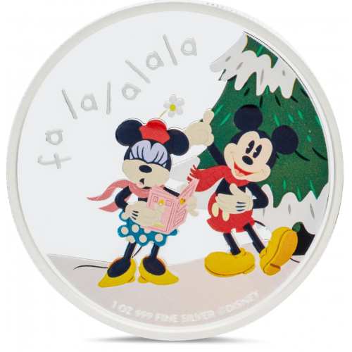 The 2024 Disney Season’s Greetings coin "Falalalala" showcases Mickey Mouse singing joyfully in a festive holiday scene. Struck from 1 oz of .999 fine silver in proof quality with colour application.