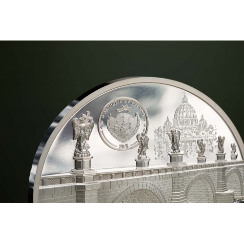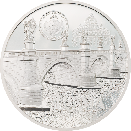 The reverse shows Rome from a bird’s-eye view highlighting selected buildings like the Colosseum, Vatican, Pantheon or Trevi Fountain. You can easily lose yourself in the highly detailed huge road network thanks to the enhanced smartminting® technology. The obverse pictures one of the most famous bridges of Rome, Ponte Sant’ Angelo. This was originally built in 134 AD by Roman emperor Hadrian to span the Tiber from the city centre to his newly constructed mausoleum, now the tower Castel Sant’ Angelo.