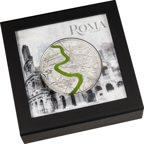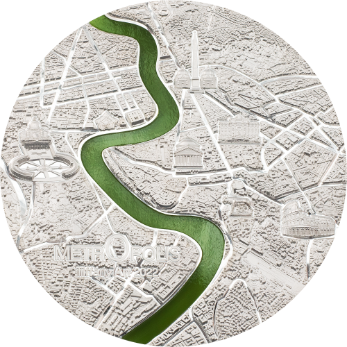 The Tiffany Art glass that the series is known for winds through the city as a representation of the River Tiber. The way the green colored glass appears to literally divide the coin in half is a ground-breaking achievement of numismatic technology! The 3 oz silver proof is limited to only 999 pieces.