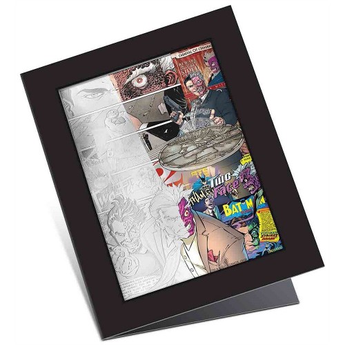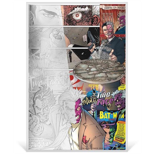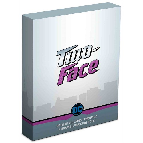 De Two-Face silver coin note — ook wel zilveren banknoot of bankbiljet — uit de Batman Villains Series. Geslagen op 5 g puur zilver met krachtige comic-illustraties van Batman’s beruchte dubbelzijdige tegenstander. Officiële DC-release uit 2019.