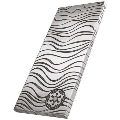 The dull, slate grey bars of Beskar steel have wavey ridges and patterns on the surface and are stamped with the Imperial shield of Palpatine’s empire. This 1oz pure silver bar has been designed to replicate this steel and an antique finish completes the transformation. This bar is also legal tender and bears the Niue Coat of Arms on the obverse along with confirmation of purity of the metal and the weight.