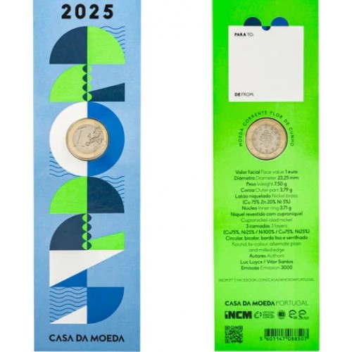 Deze speciale uitgifte van Portugal 2025 toont de standaard 1 euromunt in FDC-kwaliteit, en is geleverd in een officiële coincard met thematische presentatie.