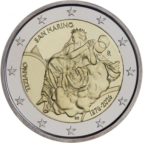 Deze officiële San Marino 2-euromunt uit 2026 herdenkt de 450e sterfdag van Tiziano Vecellio, internationaal bekend als Titian, één van de belangrijkste schilders uit de Italiaanse renaissance.