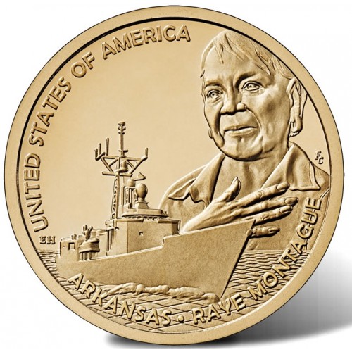The Arkansas American Innovation $1 Coin reverse (tail) design features Raye Montague visualizing a United States Navy Oliver Hazard Perry-class frigate, a ship she designed by computer. The grid pattern over the sea evokes the engineering and drafting techniques she digitized to accomplish her design. Included inscriptions are “UNITED STATES OF AMERICA,” “ARKANSAS,” and “RAYE MONTAGUE.”