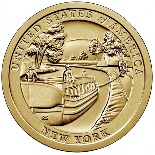 The American Innovation $1 Coin - New York pays homage to the Erie Canal. Completed in 1825, the 363-mile long, man-made waterway connected Lake Erie in the West to the Hudson River in the East. Considered an engineering marvel of its day, the canal unlocked the western interior for trade and settlement and played a critical role in the development of the State as well as the Nation.